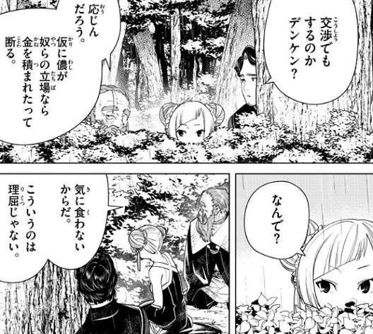 デンケン達の第13パーティーは、仲間が死んで合格の道がなくなったパーティーを見つけます。そのパーティーは隕鉄鳥だけは大事に抱えていて、リヒターは交渉でもするのか?と、デンケンに聞きますが、応じんだろう、とデンケンは推測します。自分なら金を積まれたって断るとデンケンは言い、気に食わないからだ、こういうのは理屈じゃない、とラオフェンに説明します。