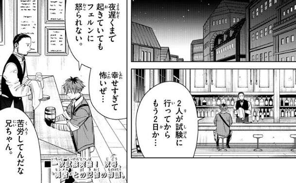 そして期限の日没を迎え、第一次試験は終了します。合格者は6パーティーでデンケン達も合格しています。場面変わって、町にいるシュタルクは酒場のような場所で飲み物を飲んで、一人の時間を楽しんでいます。夜遅くまで起きていてもフェルンに怒られない、幸せすぎて怖いぜ…、とシュタルクがつぶやくと、苦労してんだな、兄ちゃん、と店員に慰められます。