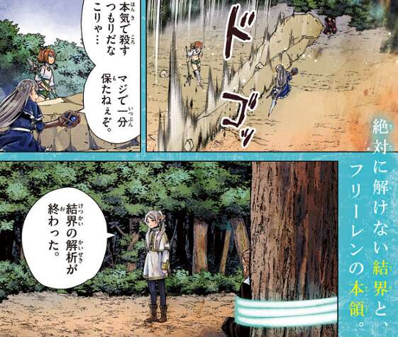 一方、結界の解析を終えたフリーレンは、結界を破ろうとします。離れた場所にいるゲナウは、天地がひっくり返ってもありえないことだ、と結界は破られないと言いますが、あっさりとフリーレンに破られてしまいます。エルフの魔法使いの名前が受験名簿にはフリーレンと書かれていて、さらに聖杖の証を持っていると分かり、…最後の魔法使いか、とゲナウはつぶやきます。