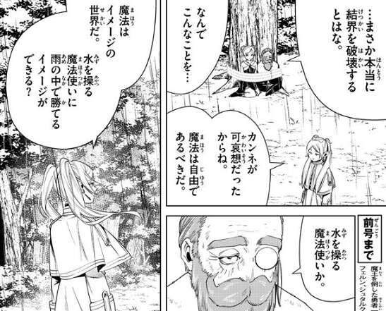 結界がなくなり雨が降っている中フリーレンは、カンネが可哀そうだったから結界を破壊したとデンケンに言います。魔法はイメージの世界だ、水を操る魔法使いに雨の中で勝てるイメージができる?と、フリーレンはデンケンに質問します。少なくとも私はできない、とフリーレンは言い、リヒターも同じだろうと言います。