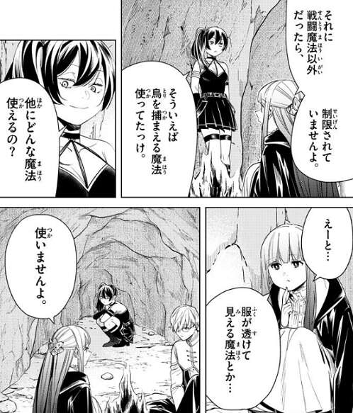 しかし、デンケンは最後まで醜く足掻くんだ、とリヒターとラオフェンに言い、他のパーティーの戦闘の痕跡を探すように言います。場面変わって、フェルンの第4パーティーは結界が壊され雨が降り出したため、雨を避けて洞窟で休憩します。フェルンとユーベルがどんな魔法が使えるかおしゃべりをしていると、第二次試験からは敵同士になるからと、手の内はあまりさらさない方がいいんじゃないの?と、ラントが忠告してきます。