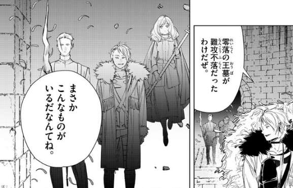 一方、デンケンのチームはラオフェンに似た者に襲われましたが、既に倒しています。デンケンは、魔法によって作られた複製体だと言い、魔族か魔物の仕業だろうと推測します。この複製体は姿だけでなく魔力も技量もラオフェンに似せていて、記憶さえも利用している可能性がある、とデンケンは言います。救いがあるとすれば一目見て偽物だと分かるところだな、とリヒターは言いますが、複数の複製体を同時に操れるとしたら、恐ろしいほどの脅威になりますね、と別の仲間が言います。デンケンは、徒党を組んでいて正解だった、対処できる手段も増える、と言うと迷宮を進んでいきます。