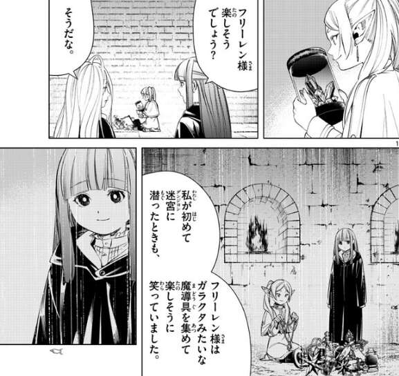 しかし、迷宮の攻略自体は順調のようで、フリーレンは未踏破の迷宮にしてはおかしい、構造的にもう最深部に近いはずだし…、と警戒します。一旦休憩を取ると、フリーレンは途中で手に入れたガラクタを見て、結構いい物が手に入ったと喜びます。一緒に付いて来ているゼンゼはそれを見て、わからんな、と言います。