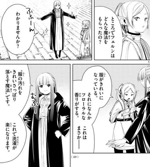 その後オイサーストを離れるため、シュタルクは町の人と別れの挨拶をします。何度かシュタルクに絡んでいた武のお爺さんとも、シュタルクはお別れの挨拶をします。その後、フリーレンとフェルンは特権の話になり、フェルンにどんな魔法をゼーリエからもらったのか聞きます。すると、フェルンは自分のきれいなった服を見せて、わかりませんか?と、フリーレンに問いかけます。フリーレンは、服がきれいになっているだけなく、なんかフローラルな香りもすることに気付くと、フェルンは“服の汚れをきれいさっぱり落とす魔法”をもらったと言います。これで洗濯が楽になります、とフェルンは自信たっぷりに話すと、フリーレンは、神話の時代に存在した伝説級の魔法だよ、でかしたフェルン、とフェルンの頭を撫でて褒めます。ゼーリエがフェルンに魔法を渡すとき、すごく嫌そうな顔をしていたとフリーレンに言うと、だろうね、いい気味だ、とフリーレンはつぶやきます。