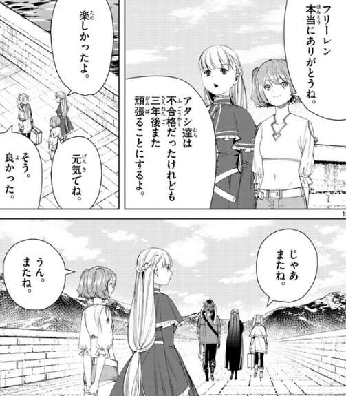 その後、橋の上でフリーレンは、ラヴィーネ、カンネと別れを告げます。ラヴィーネ、カンネは本当にありがとうと感謝を伝え、三年後の試験をまた頑張ると言い、楽しかったよ、元気でね、とフリーレンに話しかけます。しかしフリーレンは、じゃあまたね、と言うとあっさりと旅立ってしまいます。