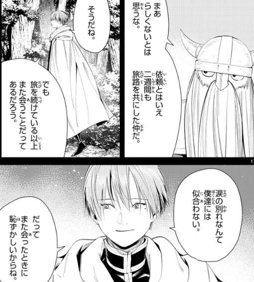 フェルンはフリーレンに、ザイン様のときもそうでしたけど、ずいぶんあっさり別れますね、と言うと、フリーレンはヒンメルと旅をしていた時の事を思い出します。ヒンメルは旅の途中に依頼人と別れるときに、依頼人に手を振るとあっさりと別れます。フリーレンはヒンメルに、ヒンメルってさ、凄くあっさりと人と別れるよね、と言うと、ヒンメルは、変かな?と、聞きます。アイゼンも、らしくないとは思うな、依頼とはいえ二週間も旅路を共にした仲だ、と言いますが、旅を続けている以上、また会うことだってあるだろう、とヒンメルは言い、涙の別れなんて僕達には似合わない、だってまた会ったときに恥ずかしいからね、フリーレン達に言います。
