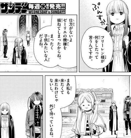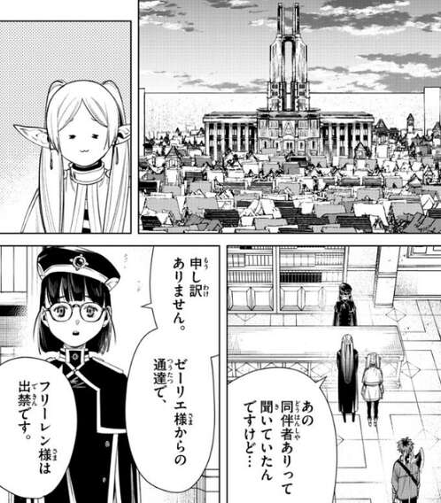 フェルンは特権の授与にフリーレン達と出席しようとしますが、フリーレンは出禁と言われてしまいます。ゼーリエからの通達で今後、千年は大陸魔法協会の施設に立ち入らないように言われてしまい、フリーレンもしょんぼりとした顔をしています。