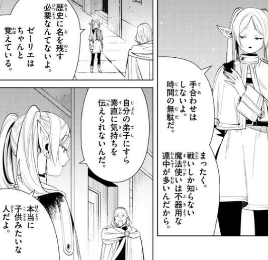 ゼーリエとの面接で、ゼーリエの部屋にあった花畑は、フランメが好きだった魔法で作られた花畑だとフリーレンは言います。そしてフリーレンは、ゼーリエはフランメの魔法をくだらない魔法だと言っていなかったけ?と、聞くと、正直フランメは失敗作だったとゼーリエは言い、あれだけの才を持ちながら私ほどの高みへは辿り着けなかった、とフリーレンに話します。その後も沢山の弟子を取ったが、どれもゼーリエの足元にも及ばないままほとんど先だった、とゼーリエは言いますが、しかし気まぐれで取ったはずの弟子なのに、一人一人の性格も好きな魔法も鮮明に思い出せる、とフリーレンに話します。そして、何故か私は弟子を取って後悔したことは一度も無い、たとえ歴史にその名を残せずとも、とゼーリエはフリーレンに言います。その話をレルネンは黙ってフリーレンから聞いていると、特権の授与が終わったフェルンが戻ってきます。
