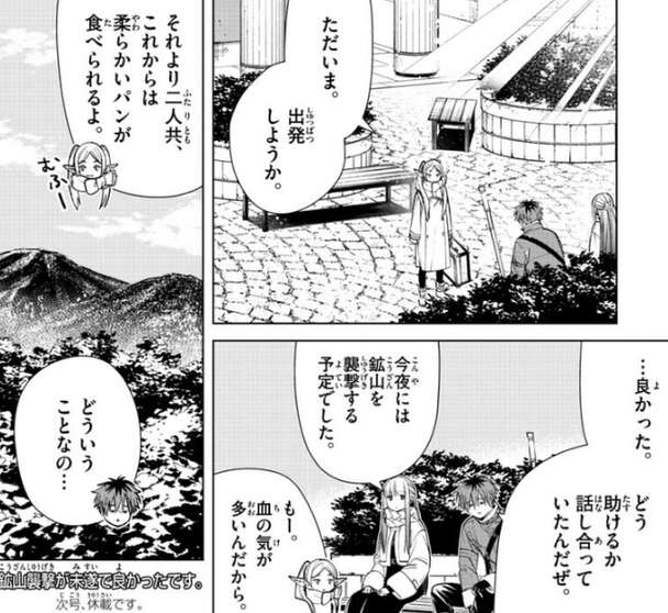 ノルムの部下が鉱山を掘り進めると、ノルムの狙い通り銀鉱が見つかり、フリーレンは無事、解放されます。フリーレンはフェルンとシュタルクの所に戻りますが、フェルンとシュタルクは何とかフリーレンを助け出そうと、今夜には鉱山を襲撃する予定だった、とフリーレンに打ち明けます。フリーレンは、これからは柔らかいパンが食べられることを二人に伝えますが、事情を知らないシュタルクは、どういうことなの…?と、戸惑います。
