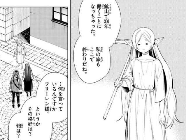 フリーレンは借金の形に捕まってしまい、鉱山で300年働くことになってしまいます。服や鞄も取り上げられてしまい、ノルムの部下に強制的に鉱山に連れていかれてしまいます。