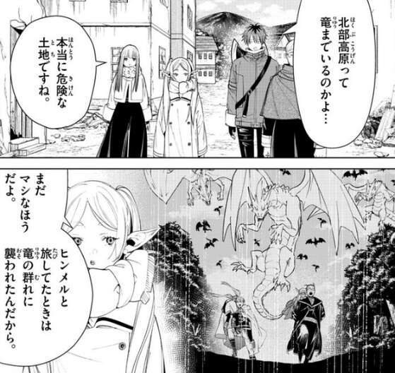 勇者ヒンメルの死から30年後、北部高原 ドラッヘ地方の村を訪れたフリーレン達ですが、その村は龍に襲われてひどい状況でした。北部高原に竜がいることにフェルンとシュタルクは驚きますが、ヒンメルと旅していた時に竜の群れに襲われたことがあるとフリーレンが二人に教えると、二人は竜の群れだなんて想像もつかないぜ…、と震えて怯えます。