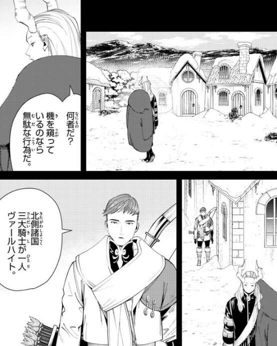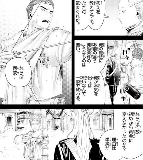 ヴァールハイトはマハトに、まだこの村は黄金に変えていないようだな、と言い、マハトが今まで集落を襲撃した時に、黄金に変えた集落とそうでない集落があって、黄金に変えるには何か複雑な発動条件があるのでは、と推測します。そして、私はその条件を満たせるような隙は与えないぞ、とマハトに言いますが、マハトはヴァールハイトの言葉を聞いて馬鹿にしたような笑みを見せます。そしてマハトは、黄金に変えるかどうかは、ただの気まぐれだと言うと、ヴァールハイトをあっという間に黄金に変えてしまいます。