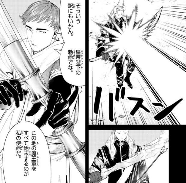 男は北側諸国 三大騎士が一人ヴァールハイトと言う名前で、皇帝陛下の勅命でマハトを始末に来ました。マハトはヴァールハイトには興味が無いようで、俺に構わないでくれ、と言い捨てます。しかし、ヴァールハイトは問答無用でマハトを攻撃します。