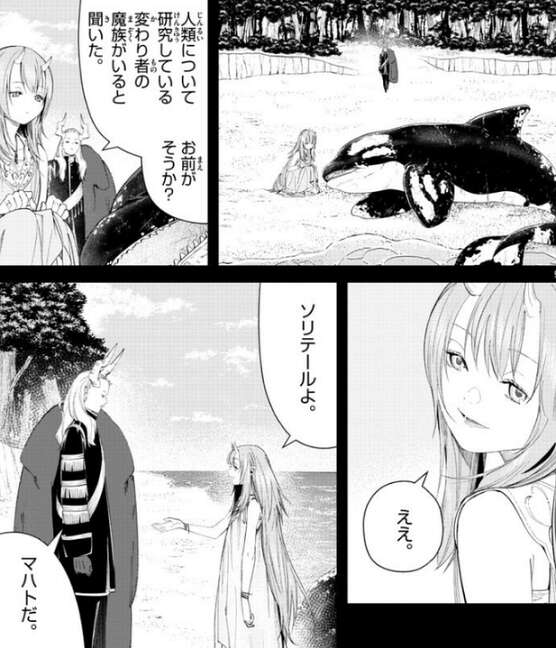 場面変わって、マハトは海の浜辺にいる魔族に会いに来ていました。魔族は人類について研究している変わり者で、名前はソリテールと名乗ります。ソリテールはマハトに握手を求めますが、マハトはソリテールを無視しして浜辺に打ち上げられているイルカの方を見ます。マハトはイルカを見たことが無いようで、海にはこんあに大きな魚がいるんだな、とソリテールに言います。