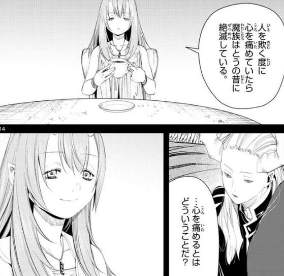 マハトは、何故魔族に“悪意”や“罪悪感”といった感情がないのか質問しますが、随分くだらないことを聞きにきたのね、とソリテールはマハトの質問をくだらないと切り捨てます。そして、人を欺くたびに心を痛めていたら、魔族はとうの昔に絶滅している、とソリテールは答えますが、マハトは心を痛めるという事がどういうことかが分かりません。