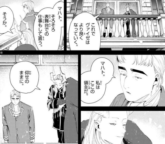 豊かになった城塞都市ヴァイゼを眺めながらグリュックは、そろそろ表舞台での仕事もして貰う、とマハトに言います。マハトは、そうか、とそっけなく答えると、私はここの領主だ、とグリュックはマハトに注意します。するとマハトは、仰せのままに、と