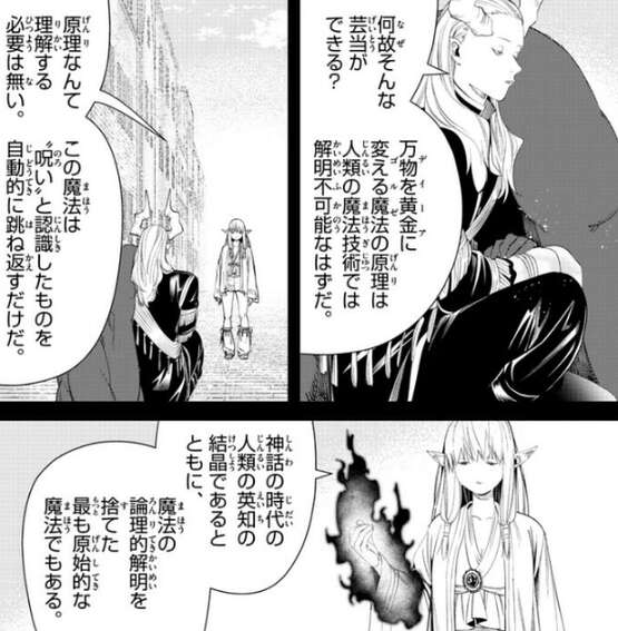 レルネン達は、マハトを殺せば万物を黄金に変える魔法(デイーアゴルゼ)も失伝し、城塞都市ヴァイゼを元に戻す機会を永遠に失ってしまう、と言い、ゼーリエを説得しようとします。しかしゼーリエは、ここでマハトを仕留めなければ被害はヴァイゼ程度では済まない、と言い、マハトはその気になれば北部高原全域を黄金に変えられるだけの力を持っている、流石に看過できん、とゼーリエの部下たちに言います。