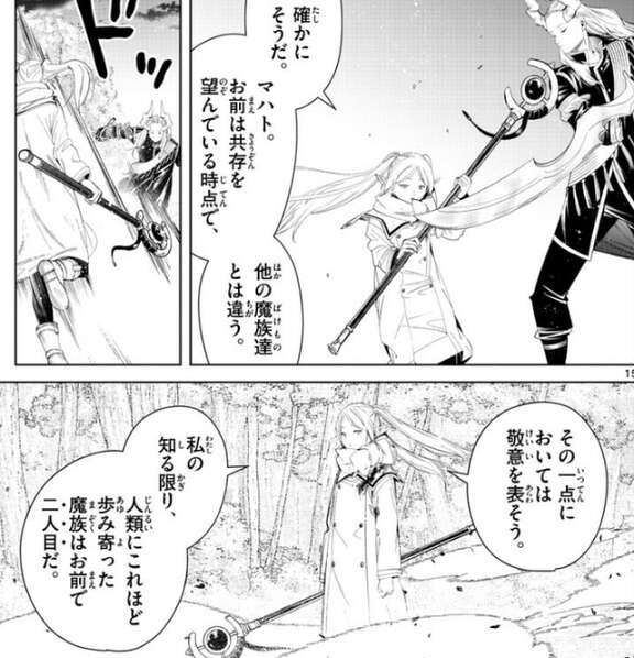 ソリテールは、マハトは人類との共存を心から望んでいる、と指摘するとデンケンの魔法攻撃をかわし、デンケンを剣で攻撃します。デンケンはソリテールの攻撃を防御魔法で防ぎますが、その間にマハトはフリーレンを剣で直接攻撃します。マハトの攻撃もフリーレンは防ぎ、一進一退の攻防が続きます。フリーレンはマハトが人類との共存を望んでいる時点で、他の魔族とは違うことを認め、その1点においては敬意を表すと言います。そして、フリーレンの知る限りでは、人類にこれほど歩み寄った魔族はマハトで二人目だと言います。