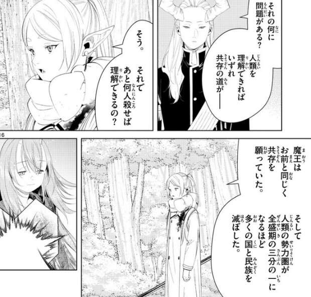 もう一人は魔王の事のようですが、フリーレンはマハトが共存を望めば望むほど、マハトの手で多くの人が殺される、と指摘します。魔王も人類と共存を願っていたようですが、人類の勢力圏が全盛期の三分の一になるほど、魔王は多くの国と民族を滅ぼした、と言います。フリーレンは、マハトの願いの行き着く先は人類の絶滅だと言い、報いを受ける時が来たんだ、黄金郷のマハト、とマハトに言い放ちます。