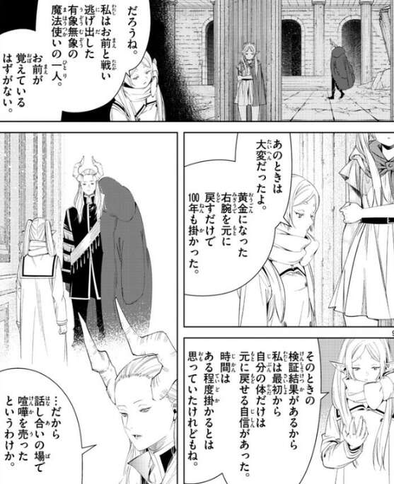 ソリテールはフリーレンがたった二か月で、万物を黄金に変える魔法(デイーアゴルゼ)の対処を完璧に行ったことに驚きますが、フリーレンは解析に使ったのは二か月だけじゃない、と言い、600年前にマハトと戦った時の事を話します。マハトは600年前にフリーレンと戦ったことを覚えていませんが、フリーレンは600年前にマハトと戦った時に右腕を黄金に変えられて、逃げ出していました。黄金になった右腕を元に戻すのに100年掛かったようですが、その時の検証結果があったからフリーレンはある程度、時間が掛かっても自分の体を元に戻せる自信がありました。
