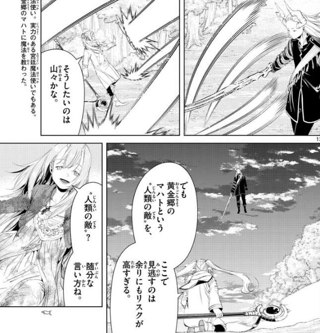 フリーレンは話を終えると、そろそろ戦いを始めよう、と言い、マハトとソリテールを魔法で攻撃します。ソリテールは大魔族二人相手なら、出来るかどうかは別として、一旦撤退するのが最善手だと思う、と言います。しかし、フリーレンは、そうしたのは山々かな、と言いつつ、黄金郷のマハトという“人類の敵”を見逃すのは余りにリスクが高すぎる、と言い撤退しようとしません。