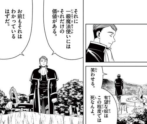 既に隕鉄鳥を捕獲していたフェルン達の第4パーティーは、ヴィアベル達の第8パーティーに襲われます。第8パーティーのエーレは“石を弾丸に変える魔法”(ドラガーテ)を使ってフェルンを攻撃しますがフェルンは全て防御魔法で防ぎ、逆に飽和魔法攻撃でエーレを圧倒します。
