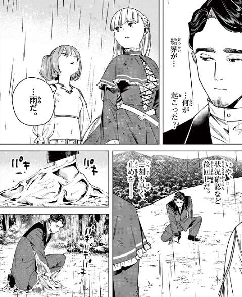 フリーレンはデンケンとラオフェンを倒して、隕鉄鳥を奪還すると、結界を破壊します。結界が破られ雨が降ってくると、カンネは水を操る魔法(リームシユトローア)で雨を操り、リヒターを攻撃しようとします。カンネはラヴィーネに、逃がさないようにね、と注意しますが、カンネの攻撃は圧倒的な質量攻撃を前に、リヒターにはそもそも逃げ場はありません。
