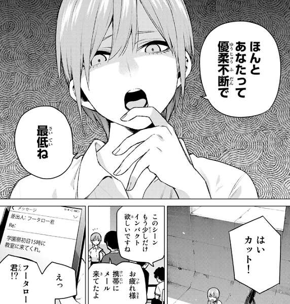 場面変わって、一花はドラマの撮影をしていて、撮影の合間に一花の携帯にメールが届きます。メールには風太郎から学園祭初日15時に教室に来てくれと、連絡が来ています。学園祭初日に五つ子と風太郎が集まり、風太郎が五人に突然告白するのですが、一花はメールを見て何の用だろ…、と変な期待をして顔を赤くしてしまいます。