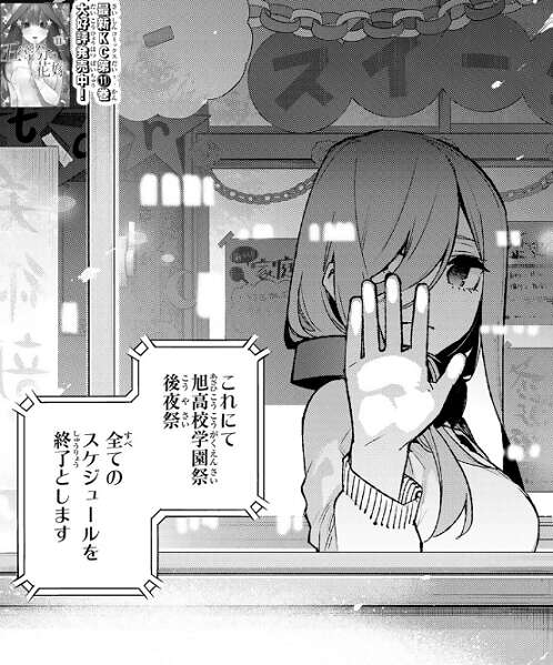 努力の甲斐もあり、学園祭当日は三玖が作るパンケーキは女子の間で大好評です。一方、男子のたこ焼き組と女子のパンケーキ組は、溝が深く男子が敵情視察に訪れているのを見て、たこ焼きには負けられないと、女子は気合を入れます。しかし、三玖は出来れば男子のたこ焼き組と意地を張らず仲よくしていきたいと考えます。