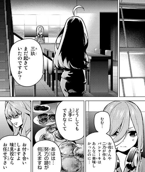 三玖は学園祭で作るパンケーキを、自宅で夜遅くまで美味しく出来るように練習しています。母親や二乃が作るパンケーキに比べて、三玖本人は納得出来ていないようです。五月は三玖にどうしてそんなに頑張るのか、質問します。