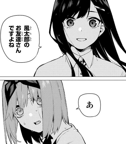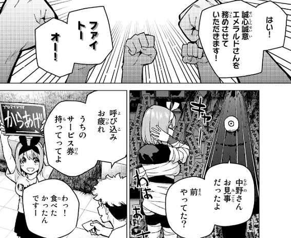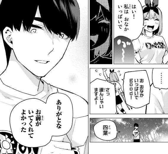ふらついている風太郎を受け止めた四葉は、まだ無理をしようとしている風太郎に休むように言い、言うことを聞くまで動かないと風太郎を止めます。その時、風太郎の腹が鳴り朝から何も食べていないと風太郎が言うと、四葉はさっきもらったからあげ屋の無料券を渡します。風太郎からいいのか?と言われますが、私はお腹いっぱいと返事をしますが四葉もお腹が鳴ってしまいます。そんな四葉に、風太郎はお前がいてくれてよかった、と感謝の言葉を口にします。