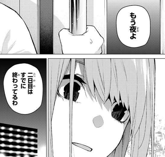 二日目から出番が増えた演劇部の劇に出ないと、演劇部の皆が困っちゃうと四葉は言い病室を出ていこうとします。しかし既に夜で、もう学園祭 二日目は終わっていると二乃は四葉に告げます。演劇部のお手伝いが出来なかったと分かり、ショックを受け絶望的な表情をする四葉です。