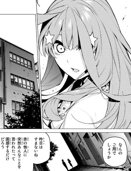 二乃にも心配され二乃は五月に食べ物を奢ろうとしますが、五月は全てを終わらせるまで邪念は断つと食べ物を断ります。五月は教師という夢は分不相応な目標だったのでしょうか、とつい弱気になってしまいますが、二乃からは学校の先生なんて立派な夢だと、五月の夢を応援していると励まされます。二乃は父親に招待状を送った話をし、こういう時に道標になってくれるのが親の役目だと言います。