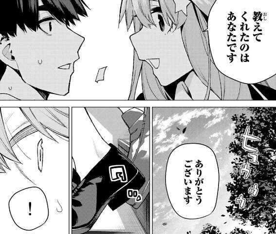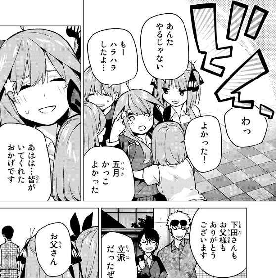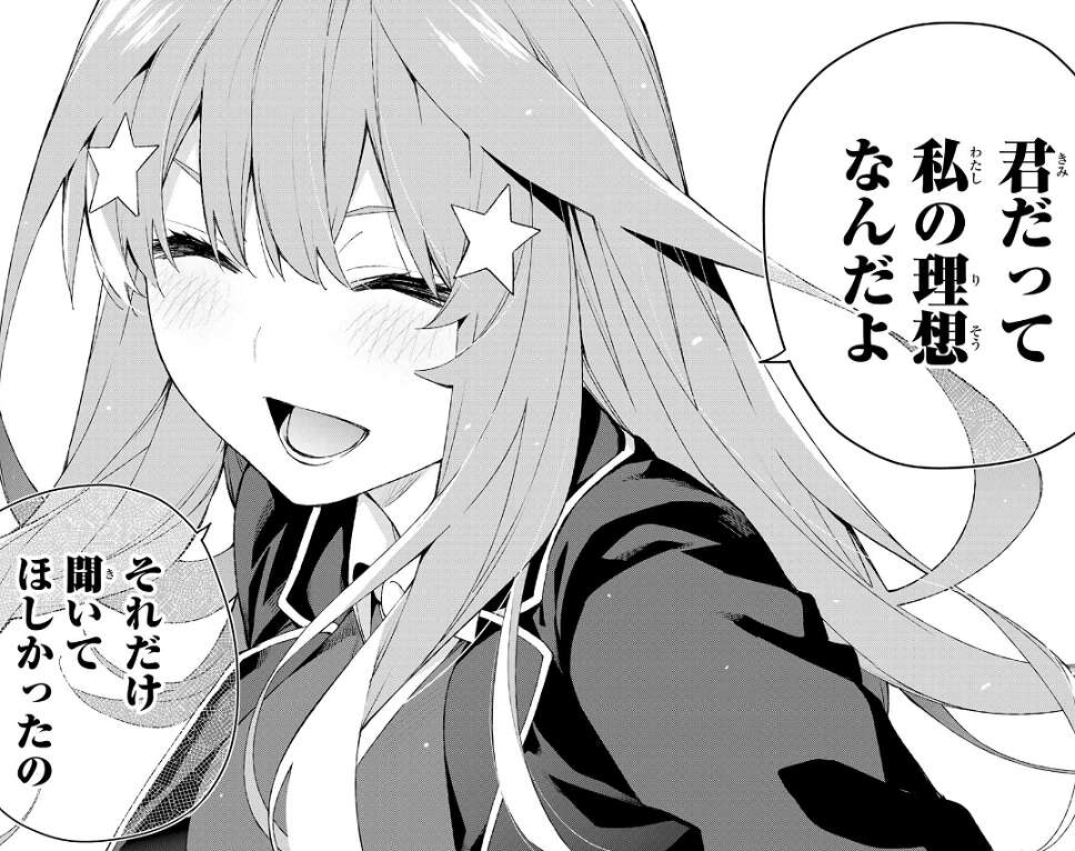 あらためて五月から感謝され、理想の教師像はお母さんのままだが、風太郎も私の理想なんだよ、それだけ聞いてほしかったの、と五月に笑顔で告白されます。