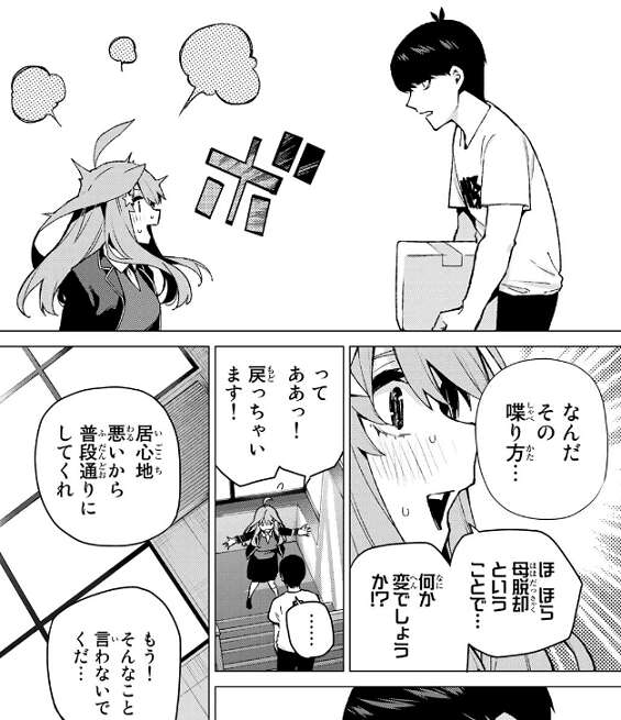 敬語なしの喋り方を風太郎に指摘され照れてしまう五月ですが、母脱却ということだと理由を話します。居心地悪いから普段通りにしてくれと風太郎には言われますが、五月はあくまで敬語なしの喋り方を続けるようです。