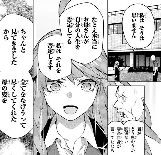 中野父からも、零奈が子供たちにどれほど希望を見出したのかを逃げ出してしまったあなたは知らないと言い、零奈を語る資格はないと断言します。五月は無堂に最後までお母さんにへの謝罪がありませんでしたね、私はあなたを許さないと言いベーをして無堂を追い返します。