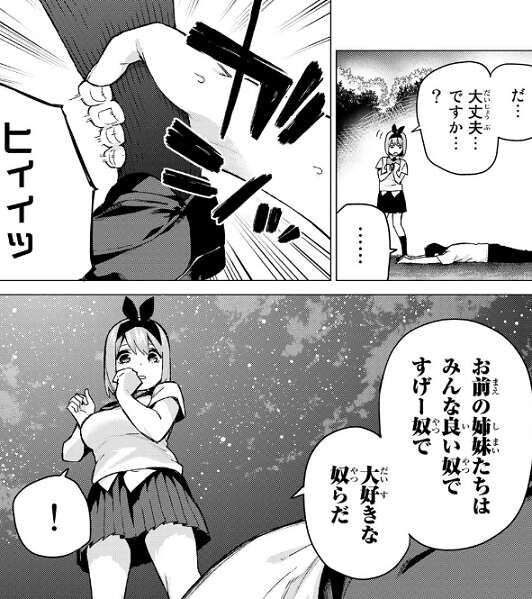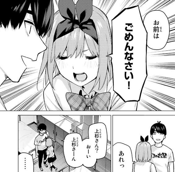 ショックを受け立ち尽くす風太郎に、光栄だが上杉さんにはもっと良い人がいるはずです、私なんかで収まっちゃもったいない!、と笑顔で言います。しかし風太郎はお前の気持ちを教えてくれと、四葉に迫ります。答えられない四葉はとっさに逃げ出してしまい、風太郎は四葉を見失ってしまいます。
