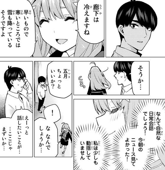 しかし、五月が決意した次の瞬間にはいきなり風太郎と出会ってしまいます。五月は今朝見た、寒いところでは雪も降っているというお天気ニュースで誤魔化しその場を去ろうとしますが、風太郎の方から話したいことがあると昼メシに誘われてしまい、五月は動揺します。