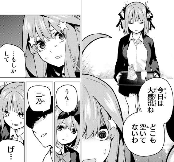 さらに二乃も現れて、二乃、四葉、五月、風太郎と四人が一緒になってしまいます。どうやら四葉が二乃を話があると誘って、お昼を一緒に食べようとしていたようです。