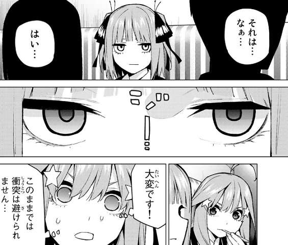次回、五月と風太郎が聞いている中、四葉と二乃が再び話し合います。