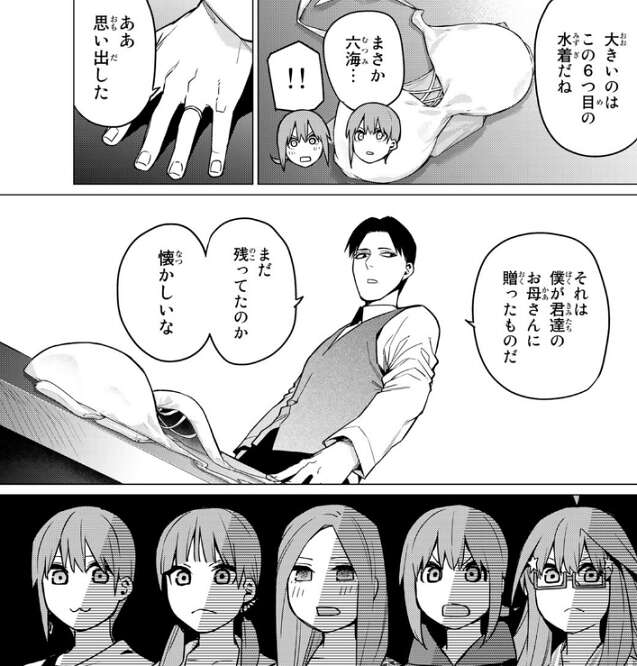 しかし、中野 父が持ってきた水着は全部が同じサイズに見えますが、六つ目の水着だけが大きいようです。すると中野 父は、それは僕が君達のお母さんに送ったものだ、まだ残ってたのか、懐かしい、と言います。それを聞き、五つ子たちは全員が微妙な表情をします。