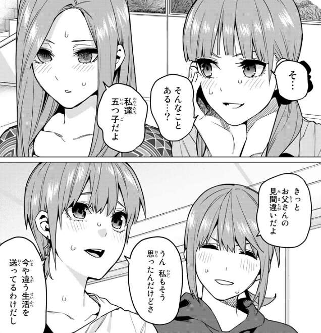 最後に風太郎が、五人の水着の試着に来た時の事を思い出します。五度も来店した風太郎に、うちの商品…お気に召しませんでしたか?と、店員が尋ねますが、風太郎は違うんですよ、と訳を説明します。めんどくさいと言い、あいつら…、五つ子なんで、と店員に話します。最後は笑顔の五つ子たちが描かれます。