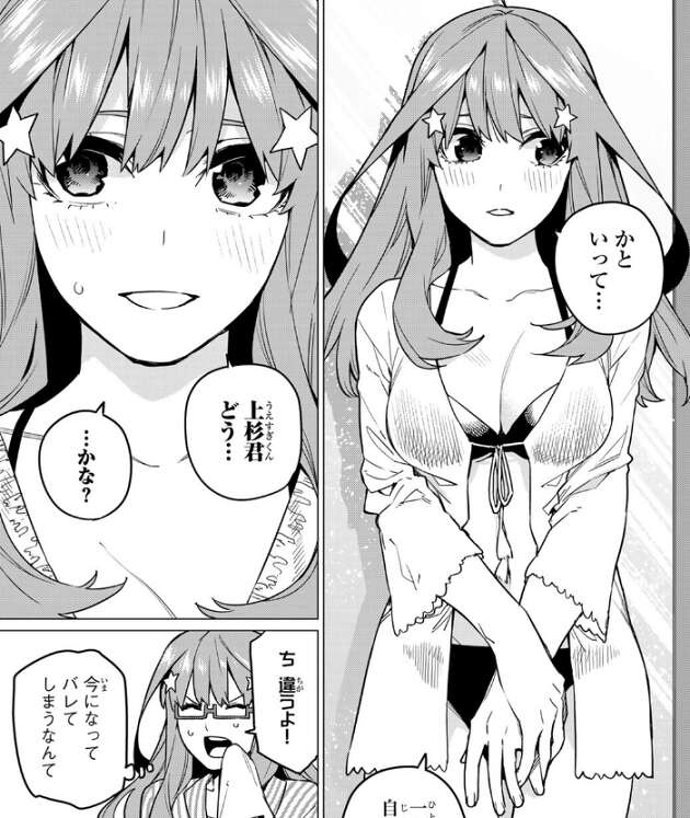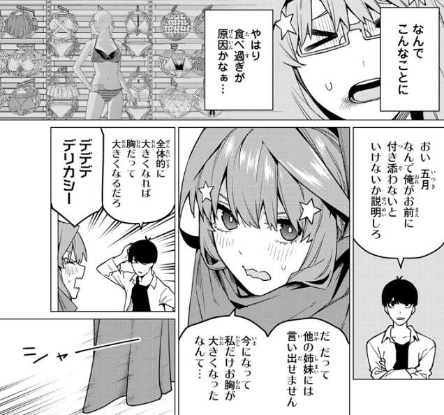 五月は自分だけお胸が大きくなり、他の姉妹に言い出せないと、風太郎を連れて水着の試着に行っていました。風太郎に水着が似合うか、聞いています。五月は風太郎と一緒に水着の試着に来ていたようで、その時の事を思い出します。