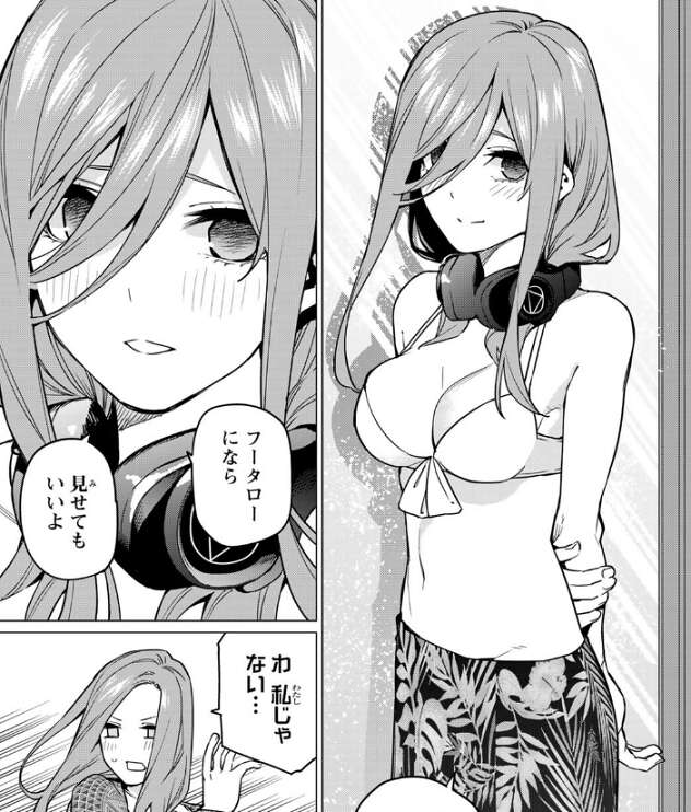 内容は、中野家の実家で一着だけ明らかに他より大きな水着が見つかり、誰の水着か犯人を捜す、といものです。しかし、風太郎は律義に五人全員の水着の試着に付き合っているんですね。
