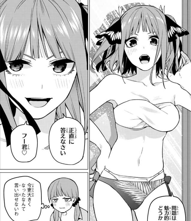 二乃は一花の、抜群のプロポーションはまだまだ成長中だと言い、一花の水着ではないかと言い出します。一花も風太郎と一緒に水着の試着に来ていたようで、その時の事を思い出します。
