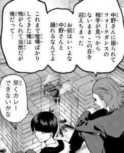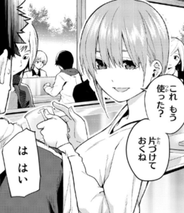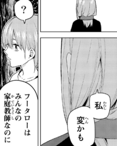 一花(中身は三玖ですが)に告白した男子生徒が再登場しましたが、風太郎は無関心です。ふられた事を、愚痴っています。