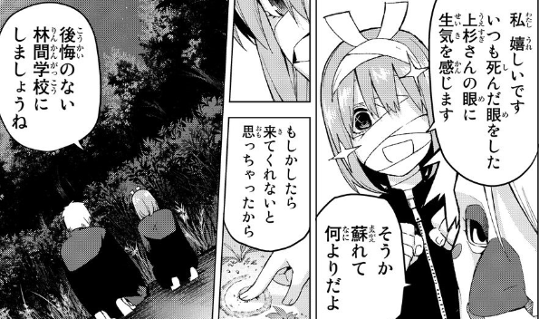 そのまま二乃と五月が会話しながら歩いていると、木の上から変装した風太郎が勢いよく降りてきて思わず五月は走って行ってしまいます。そのままお約束の看板に従わず迷子コースです。