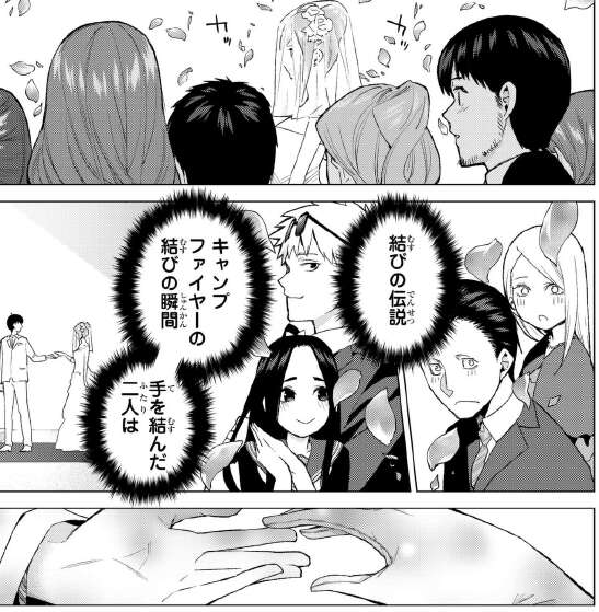 らいはが冒頭から大人です。しかしキャンプファイヤーの結びの瞬間は五つ子の誰かは、以前不明です。結びの伝説の条件は全員で風太郎の手を握っていることから、全員満たしているので、まだまだどうなるかは分かりませんね。