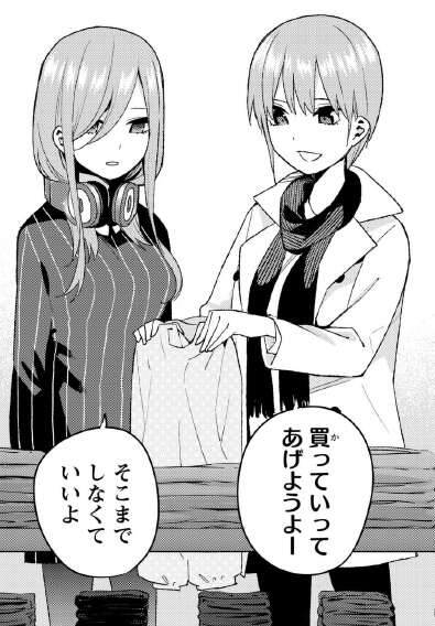 しかし一花と三玖の買い物現場に遭遇してしまいます。内容的に、風太郎への買い物のような気が。。。