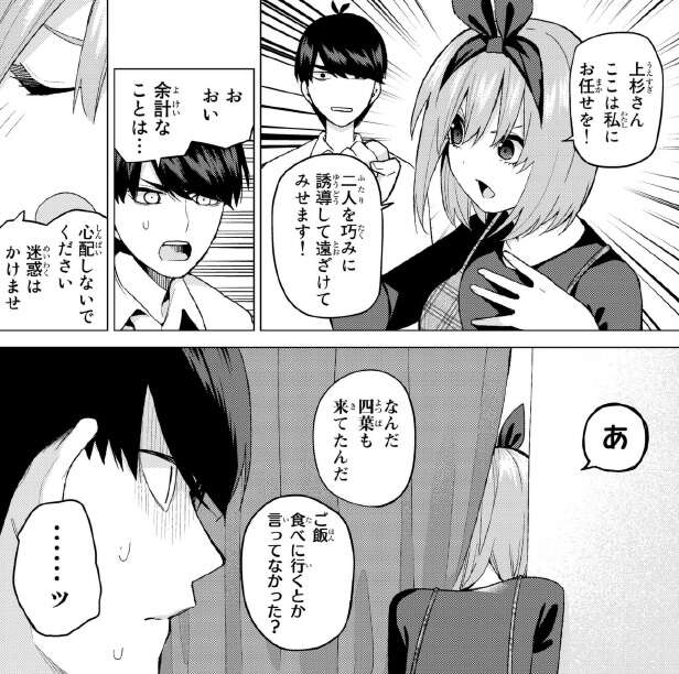 前回からの四葉とのデート回、終了ですが目をつむっていたとはいえ、風太郎の前で着替えるとは四葉も意外と大胆です。公園でも風太郎といい感じになっていました。四葉の個別回は貴重なので、すごく楽しめました。
